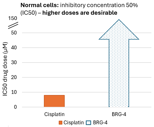 Drug safety is critical for the use of any therapeutic agent.Cisplatin is a commonly used anticancer agent, but its use is limited by its toxicity. It suppressed the growth &/or kills 50% of tumors cells at a dose that is ~7 microM.BRG drugs deliver two ingredients.(1)The major one is FDA-approved as the active form of an older, cell protective agent.(2)The other ingredient is a common drug conjugate used in FDA-approved drugs.BRG-4 did not achieve IC50 level effects (it did not suppress the growth or kill) 50% of normal (primary) cells at the highest doses that could be dissolved.